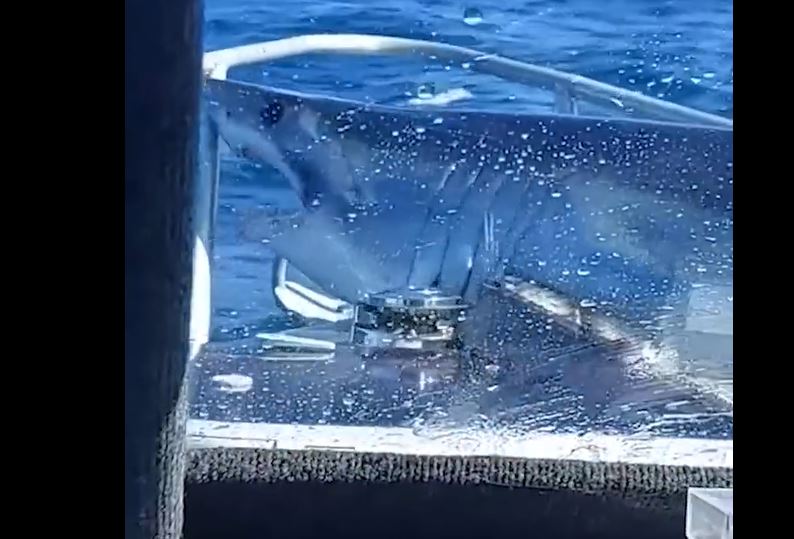 Στο βίντεο που ανέβηκε στα social media φαίνεται ο καρχαρίας να πηδάει στην πλώρη και να σπαρταράει εγκλωβισμένος στα κάγκελα του σκάφους. Λίγο μετά σταμάτησε να κινείται.