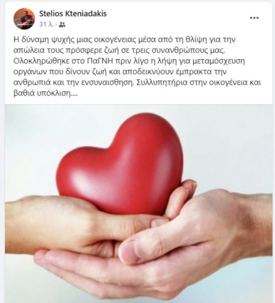 «Η δύναμη ψυχής μιας οικογένειας μέσα από τη θλίψη για την απώλεια τους πρόσφερε ζωή σε τρεις συνανθρώπους μας. Ολοκληρώθηκε στο ΠαΓΝΗ πριν λίγο η λήψη για μεταμόσχευση οργάνων που δίνουν ζωή και αποδεικνύουν έμπρακτα την ανθρωπιά και την ενσυναισθηση. Συλλυπητήρια στην οικογένεια και βαθιά υπόκλιση…».