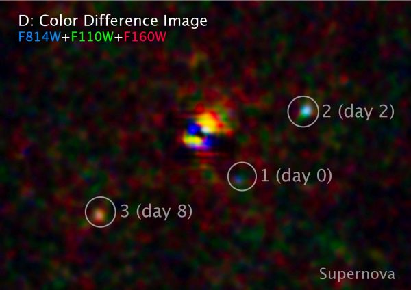 Οι κύκλοι με τους αριθμούς 1,2,3 αντιστοιχούν στα τρία είδωλα του ίδιου σουπερνόβα (NASA, ESA, STScI, Wenlei Chen,, Patrick Kelly, Hubble Frontier Fields)
