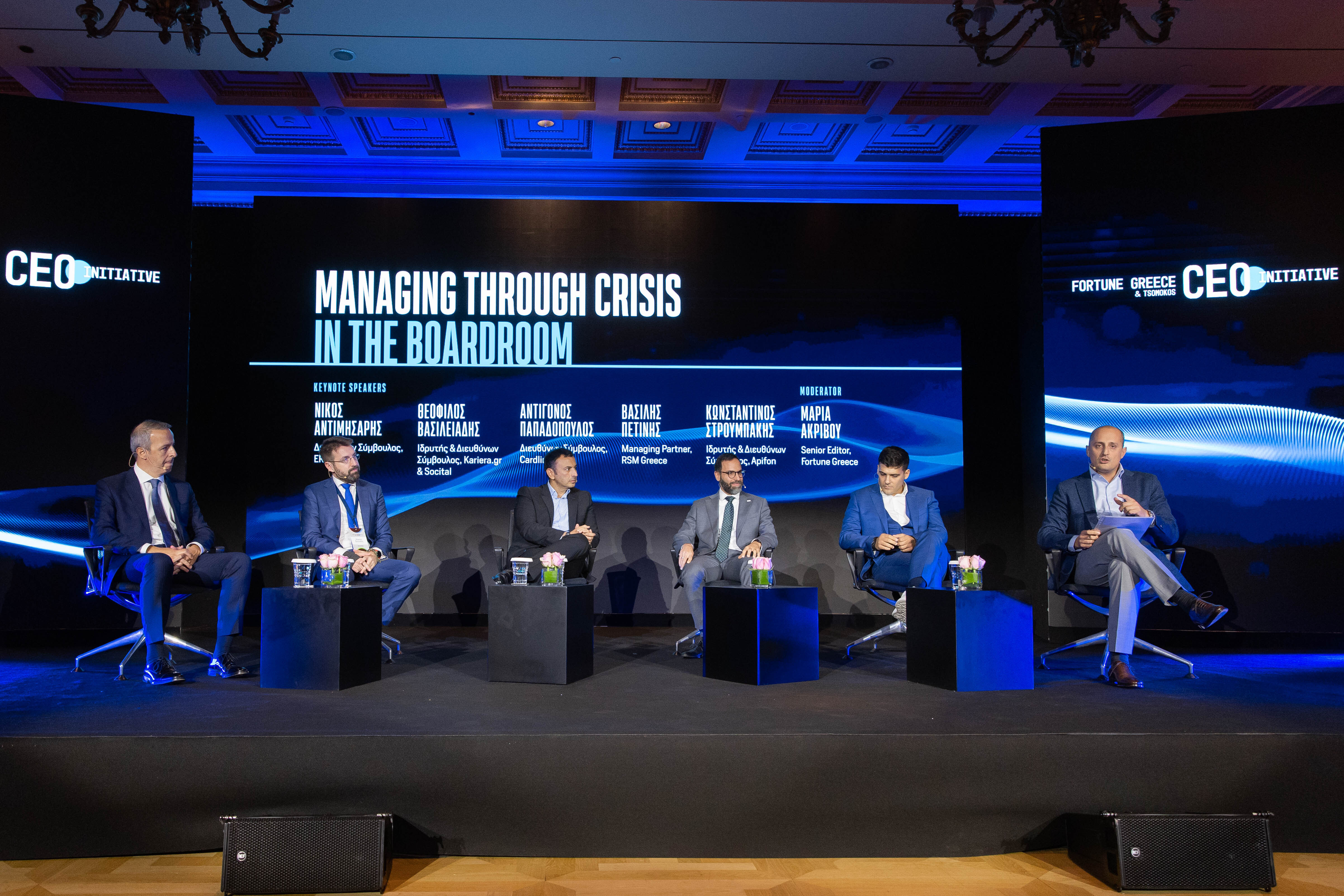 Από αριστερά ο κ. Νίκος Αντιμησάρης, CEO, ERGO, ο κ. Θεόφιλος Βασιλειάδης, CEO & Founder, Kariera.gr & Socital, ο κ. Αντίγονος Παπαδόπουλος, CEO, Cardlink. ο κ. Βασίλης Πετίνης, Managing Partner, RSM Greece, ο κ. Κωνσταντίνος Στρουμπάκης, Founder & CEO, Apifon και συντονιστής του πάνελ κ.Τάσος Ζάχος, Editor in Chief, Fortune Greece