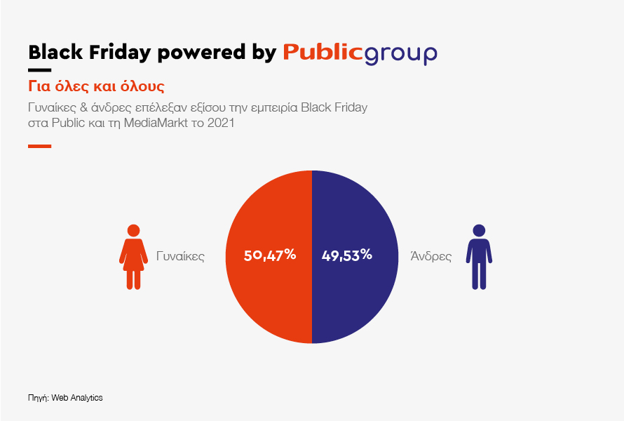 Σύμφωνα με τα βασικά trends που παρατηρήθηκαν, με βάση τα όσα κατέγραψε η ομάδα του Public Group για τη Black Friday 2021, στην online Black Friday 2021, συμμετείχαν δυναμικά και τα δύο φύλα. Με ποσοστό 50,47% (Γυναίκες) και 49,53 (Άνδρες), τα δύο φύλα εκπροσωπήθηκαν εξίσου.