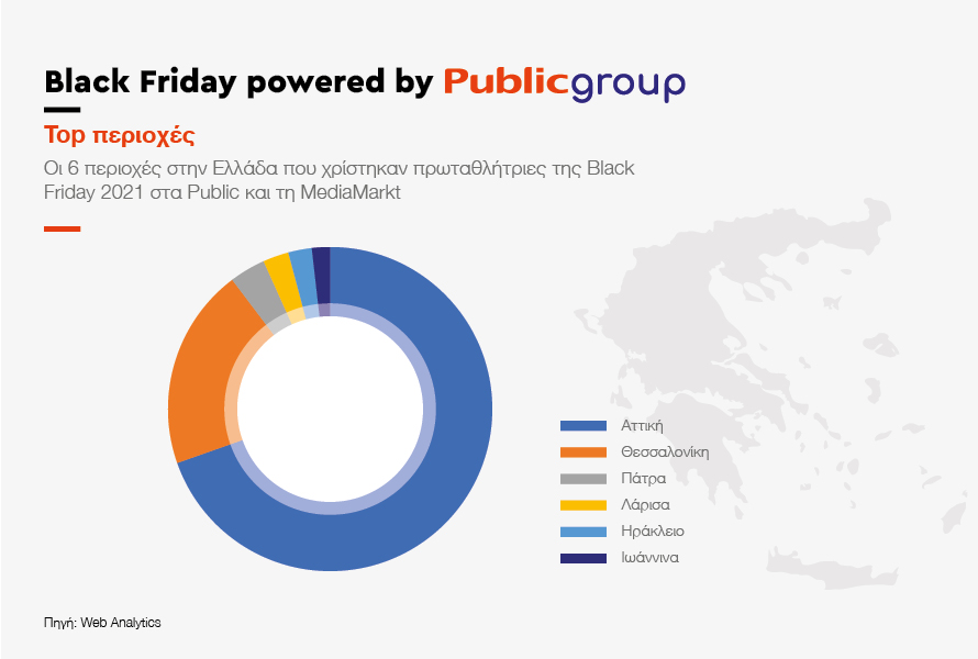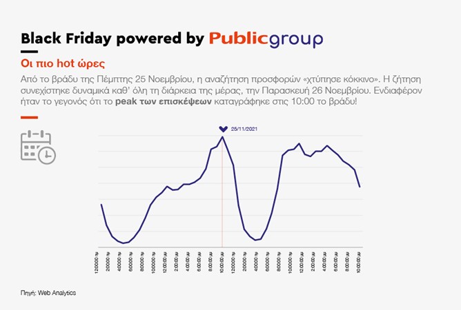 Όσον αφορά τις ώρες που γίνονται οι online αγορές κατά τη Black Friday, το 2021 οι πιο “hot” ώρες: από το βράδυ της Πέμπτης 25 Νοεμβρίου, η αναζήτηση προσφορών “χτύπησε κόκκινο”. Η ζήτηση συνεχίστηκε δυναμικά καθ’ όλη τη διάρκεια της Black Friday 26 Νοεμβρίου. To peak των αναζητήσεων σημειώθηκε την περίοδο αναμονής, την Πέμπτη 25 Νοεμβρίου 2021, στις 10μμ. Τα ίδια στοιχεία της εταιρείας αναδεικνύουν τις πρωταθλήτριες περιοχές για αγορές. Ανάμεσα στις πόλεις που διακρίθηκαν σε online Black Friday αγορές, ξεχώρισαν η Αθήνα, η Θεσσαλονίκη, η Πάτρα, η Λάρισα, το Ηράκλειο αλλά και τα Ιωάννινα.