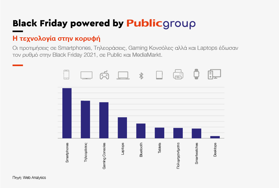 Την τιμητική τους έχουν – κατά παράδοση – τα προϊόντα τεχνολογίας κατά την εκπτωτική περίοδο της Black Friday, σύμφωνα και με το ΣΕΠΕ. Επαληθεύοντας αυτήν την παράδοση της, το 2021 οι Έλληνες καταναλωτές τίμησαν με την αγοραστική τους ψήφο τα προϊόντα τεχνολογίας. Τα smartphones συγκέντρωσαν – κατά κύριο λόγο – το ενδιαφέρον των online καταναλωτών. Από κοντά ακολούθησαν οι τηλεοράσεις και οι gaming κονσόλες, τα laptops, οι Bluetooth συσκευές ήχου, τα tablets, τα πολυμηχανήματα, τα smartwatches και οι desktop υπολογιστές.