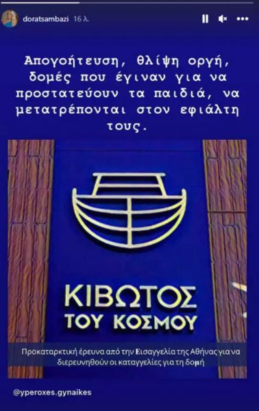 Τέλος, και η Δώρα Τσαμπάζη έκανε ανάρτηση, σημειώνοντας: «Απογοήτευση, θλίψη, οργή, δομές που έγιναν για να προστατεύουν τα παιδιά, να μετατρέπονται σε εφιάλτη τους».