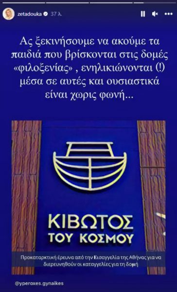 Η Ζέτα Δούκα, ανέφερε σε story της: «Ας ξεκινήσουμε να ακούμε τα παιδιά που βρίσκονται στις δομές “φιλοξενίας” ενηλικιώνονται (!) μέσα σε αυτές και ουσιαστικά χωρίς φωνή».