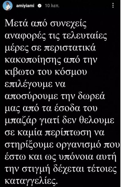 Με ανάρτησή της στα social media ανακοίνωσε ότι αποσύρει τη δωρεά και θα ψάξουν να βρουν άλλον φιλανθρωπικό οργανισμό.