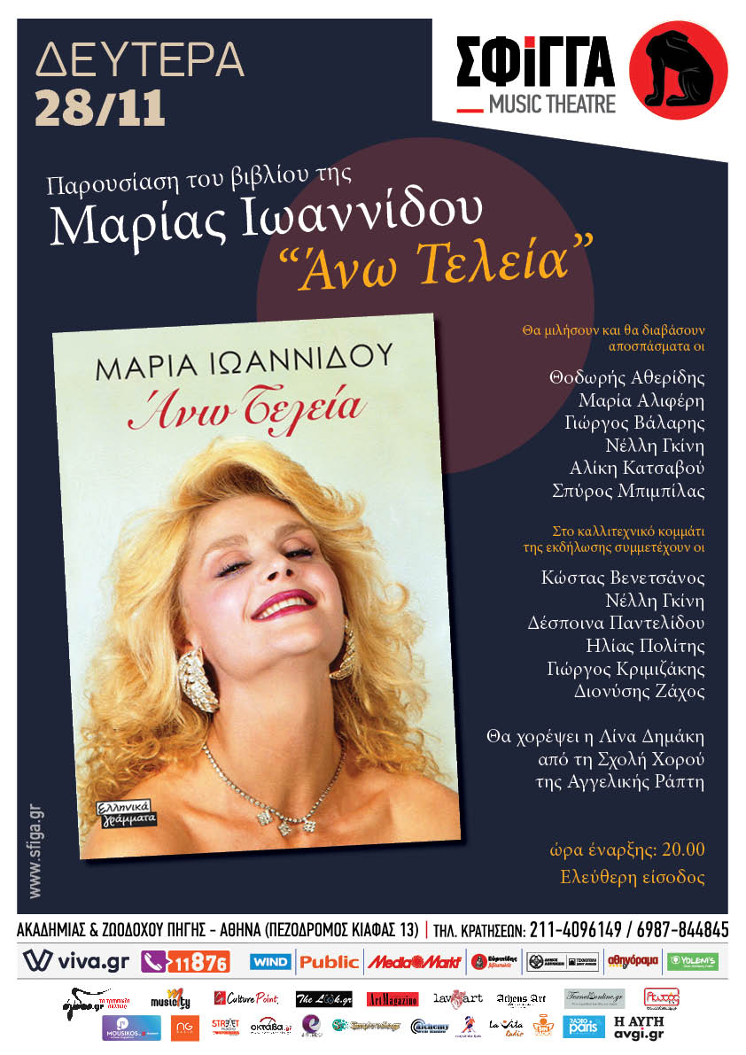 Μια ειδική εκδήλωση διοργανώνουν οι εκδόσεις Ελληνικά Γράμματα για την παρουσίαση του βιβλίου της Μαρίας Ιωαννίδου «Άνω τελεία» που θα πραγματοποιηθεί τη Δευτέρα 28 Νοεμβρίου και στις 8 μ.μ, στη μουσική σκηνή Σφίγγα.