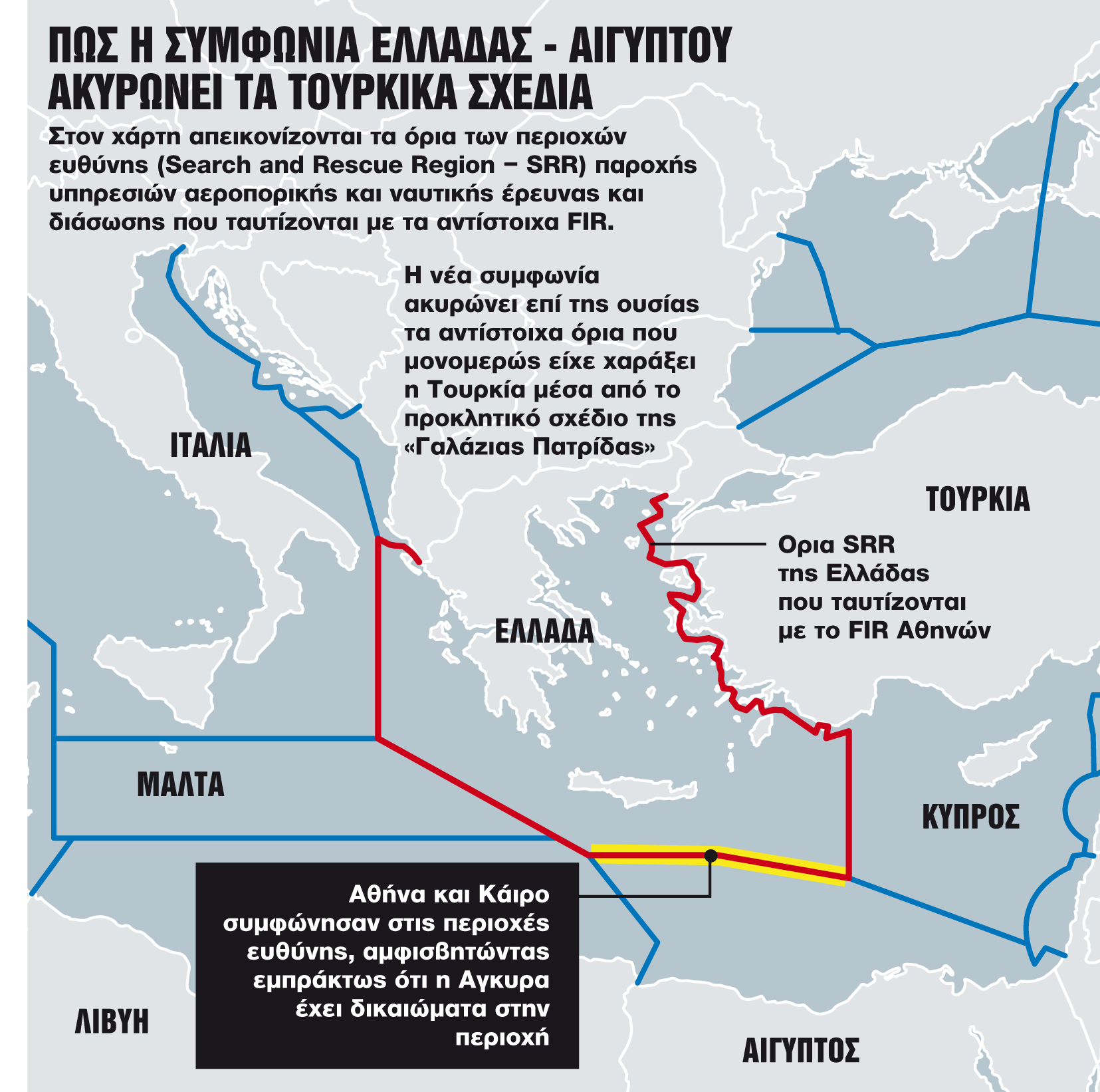 Η συμφωνία Ελλάδας – Αιγύπτου για την έρευνα και διάσωση που υπέγραψαν οι υπουργοί Αμυνας έρχεται να απαντήσει και στη μονομερή επέκταση του εύρους της περιοχής έρευνας και διάσωσης της Τουρκίας το 2020 στα όρια της «Γαλάζιας Πατρίδας», ενώ θεωρείται και μια κίνηση που αποσκοπεί στην ενίσχυση των ελληνικών θέσεων απέναντι στο τουρκολιβυκό μνημόνιο του 2019. Και δη σε περιστατικά έρευνας και διάσωσης που η Τουρκία επιχειρεί πάγια να εργαλειοποιήσει. Σύμφωνα με τη διακρατική συμφωνία που υπεγράφη χθες οριοθετούνται διμερώς, όπως δηλαδή προβλέπεται στη σχετική Διεθνή Σύμβαση του 1979, οι περιοχές ευθύνης τους στα περιστατικά Ερευνας και Διάσωσης, στις περιοχές εκείνες που συμπίπτουν με τα FIR Αθηνών και Καΐρου. Βάσει αυτής προβλέπεται η κοινή δράση των δύο πλευρών στις εκατέρωθεν οριοθετημένες περιοχές.