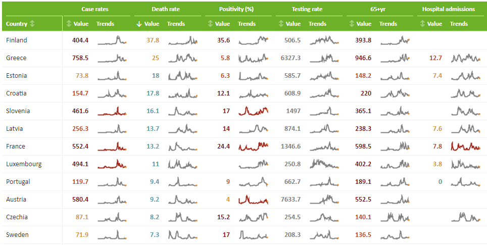 Στην Ελλάδα, το απόλυτο ρεκόρ θνησιμότητας καταγράφηκε στη διάρκεια του φονικού Νοεμβρίου του 2021, όταν καταγράφηκαν σε δύο εβδομάδες 133 θάνατοι ανά εκατομμύριο κατοίκων.