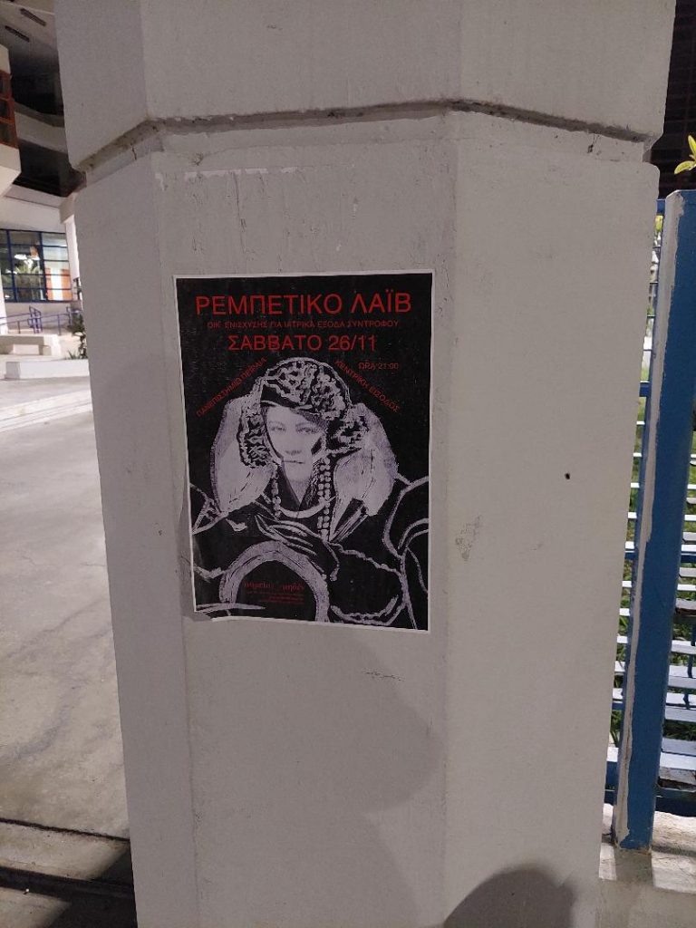 Πλησιάζουμε την κεντρική πύλη, η οποία είναι εντελώς ανοικτή, και βλέπουμε μια αφίσα η οποία γράφει: «Ρεμπέτικο λάιβ ενίσχυσης για τα ιατρικά έξοδα… συντρόφου. Ωρα 21.00 κεντρική είσοδος».