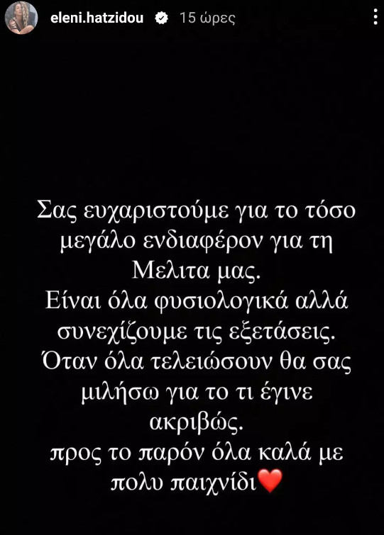 Η τραγουδίστρια δέχτηκε μηνύματα συμπαράστασης από τους διαδικτυακούς φίλους της για γρήγορη ανάρρωση της μικρής και εκείνη απάντησε: «Σας ευχαριστούμε για τόσο μεγάλο ενδιαφέρον για τη Μελίτα μας. Είναι όλα φυσιολογικά αλλά συνεχίζουμε τις εξετάσεις. Όταν όλα τελειώσουν θα σας μιλήσω για το τι έγινε ακριβώς. Προς το παρόν όλα καλά με πολύ παιχνίδι».