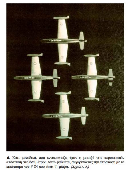 Η παρέλαση της Μεραρχίας άρχισε. Ο Στρατάρχης Τίτο έδειχνε εντυπωσιασμένος. Ξαφνικά το κλίμα διαφοροποιήθηκε. Δεν ξέρω αν έχει συμβεί ποτέ, οπουδήποτε στον κόσμο, να γίνει σεισμός με ταυτόχρονη πτώση κεραυνού. Αυτό νιώσαμε όλοι μας. Ο Τίτο δεν μπόρεσε να συγκρατήσει την ταραχή του. Ηρέμησε μόνο όταν είδε μπροστά του το Σμήνος των τεσσάρων αεριωθουμένων αεροσκαφών F-84G να ανυψώνεται κατακόρυφα προς τον ουρανό, να συνεχίζει ανάστροφα και να εκτελεί ελιγμό βύθισης για την ολοκλήρωση της ανακύκλωσης.