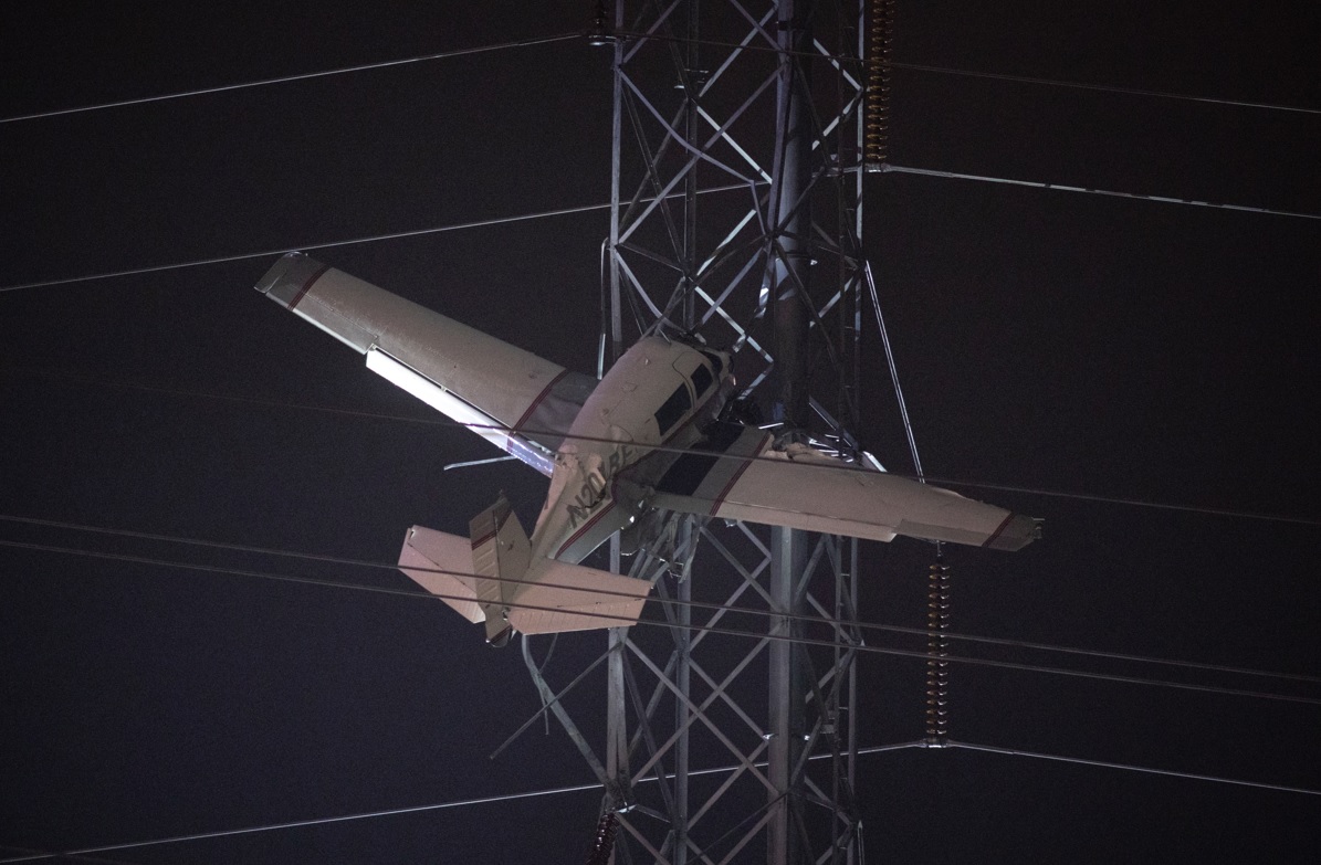 Update – Gaithersburg, Maryland, @MontgomeryCoMD small plane into powerlines & tower plow, suspended about 100 feet in the air, two persons on board uninjured at this time, @mcfrs on scene, Widespread power outages, some roads closed in area, https://t.co/VRLGfpyFaA pic.twitter.com/3iCMW0v94j