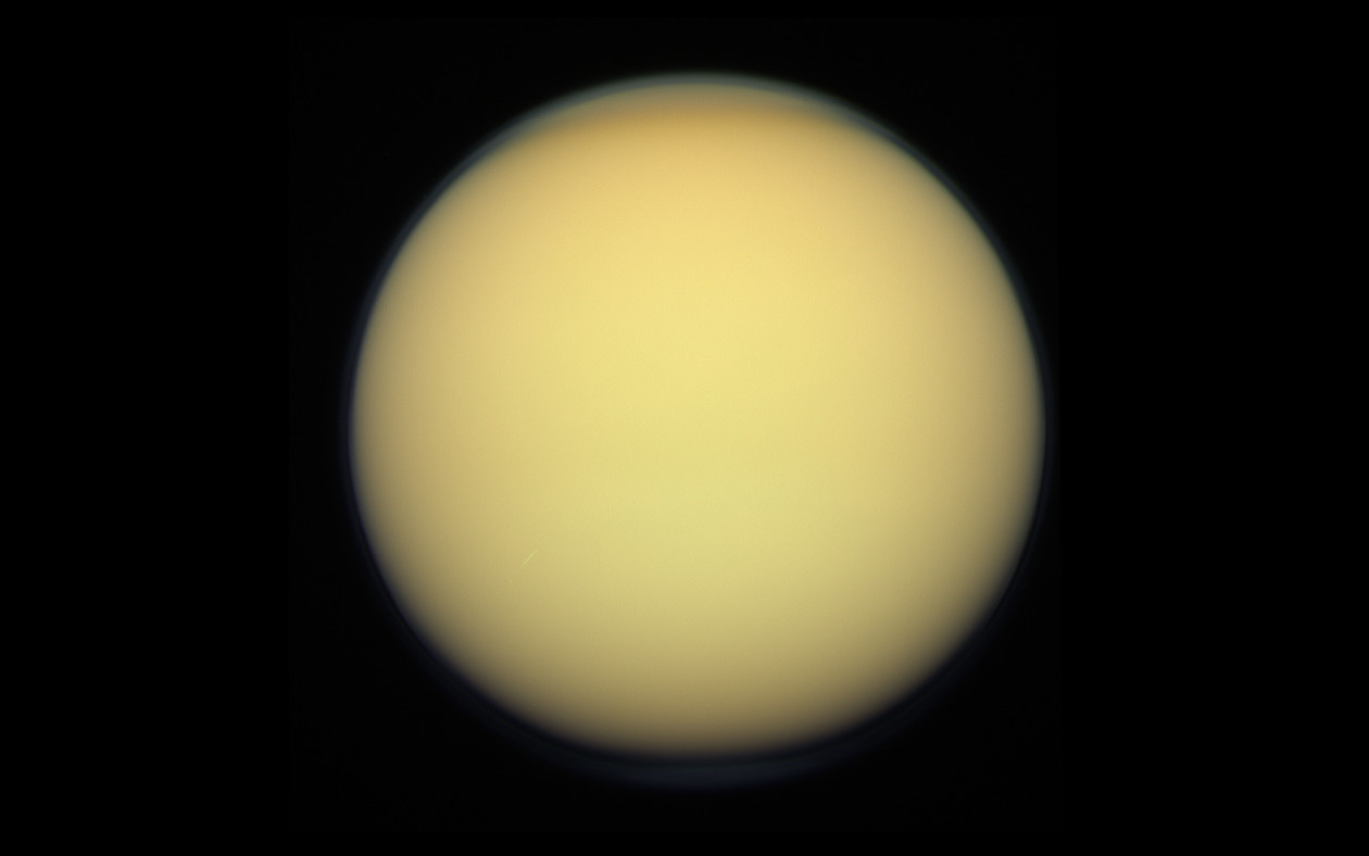 O Τιτάνας σε εικόνα φυσικού χρώματος. Η επιφάνεια κρύβεται από την πορτοκαλί ομίχλη (NASA/JPL-Caltech/SSI/Kevin M. Gill)