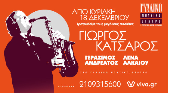 Ο μεγάλος συνθέτης-μαέστρος Γιώργος Κατσαρός επιλέγει μερικά από τα πιο ξεχωριστά, αγαπημένα τραγούδια των σπουδαίων συνθετών μας, συνθέτοντας ένα μοναδικό ταξίδι σε διαφορετικές εποχές και είδη. Ο αγαπημένος καλλιτέχνης θα βρίσκεται στο Γυάλινο Μουσικό Θέατρο από την Κυριακή 18 Δεκεμβρίου και κάθε Κυριακή, με την συμβολή δύο σπουδαίων ερμηνευτών, της Λένας Αλκαίου και του Γεράσιμου Ανδρεάτου.