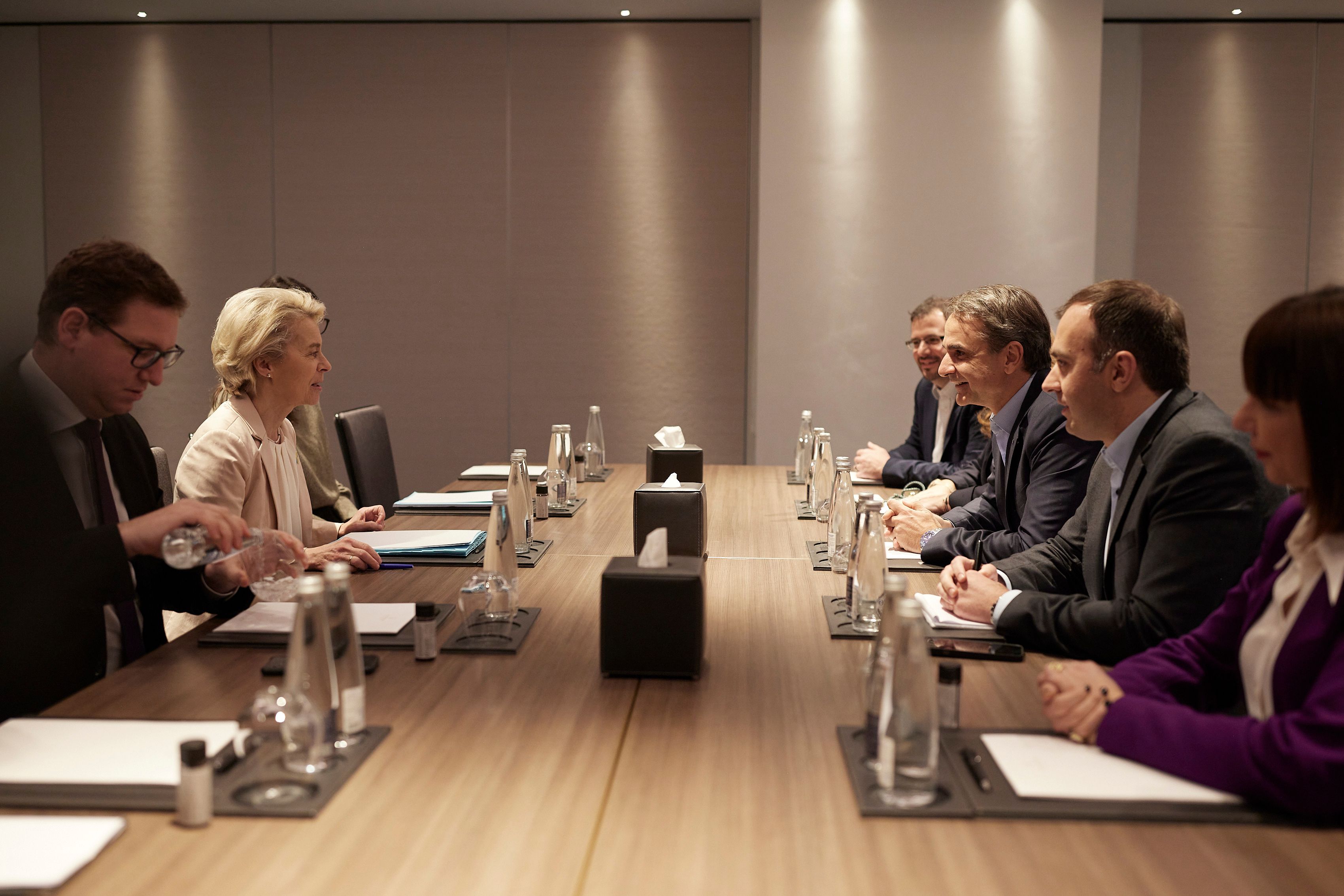Στη συνάντηση του πρωθυπουργού με την πρόεδρο της Ευρωπαϊκής Επιτροπής, που προηγήθηκε, συζητήθηκαν οι προκλήσεις που αντιμετωπίζει η Ευρωπαϊκή Ένωση, με έμφαση στον πόλεμο στην Ουκρανία και σε κοινές λύσεις για την αντιμετώπιση των συνεπειών της ενεργειακής κρίσης, ενόψει και του επόμενου Ευρωπαϊκού Συμβουλίου.