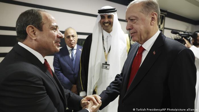 Συγκεκριμένα, σύμφωνα με την Deutsche Welle, αυτό είπαν πρόσφατα ο Αιγύπτιος πρόεδρος Αμπντέλ Φατάχ αλ Σίσι και ο Τούρκος ομόλογός του Ρετζέπ Ταγίπ Ερντογάν στην τελετή έναρξης του Παγκοσμίου Κυπέλλου Ποδοσφαίρου στο Κατάρ. Η χειραψία τους παρουσία του εμίρη του Κατάρ Ταμίμ μπιν Χαμάντ Αλ Θάνι και η ανακοίνωση ότι θέλουν να βελτιώσουν τις σχέσεις τους στο μέλλον, έκαναν τον γύρο του κόσμου. Και πράγματι, λίγο μετά τη συμβολική χειραψία καταγράφηκε κινητικότητα.
