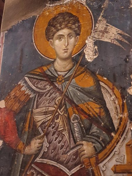 Σε μεγάλο μέγεθος είναι και η τοιχογραφία του Αγίου Γεωργίου, που βρίσκεται σε άριστη κατάσταση. Όπως αναφέρει στο ΑΠΕ-ΜΠΕ ο κ. Πυρετζίδης, «την εκκλησία εικάζεται ότι μπορεί να την έχτισε ο κράλης της Σερβίας Στέφανος ο ΙΣΤ΄ Μιλουτίν που νυμφεύτηκε τη Σιμωνίδα, θυγατέρα του Ανδρόνικου του Β΄ του Παλαιολόγου. Η σύνδεση του ιερού ναού με τον Κράλη από τη Σερβία, πιστοποιείται και με αυτή την αγιογραφία όπου ο άγιος Γεώργιος αναγράφεται ως και άγιος Γωργός, γεγονός που δε συμβαίνει στις ελληνικές τοιχογραφίες, οπότε καταλαβαίνουμε ότι ίσως οι Σέρβοι είχαν κάποια σχέση στην ίδρυσή του», τονίζει ο κ. Πυρετζίδης. Ως ιδρυτής του ναού ωστόσο, έχει προταθεί από άλλους ερευνητές ο Νίκων Σκουτέριος Καπανδρίτης Ορφανός.