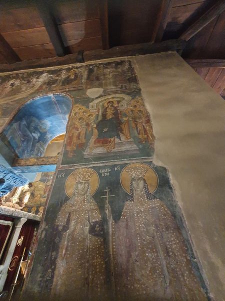 Αριστερά έξω από το κυρίως μέρος αναπαριστώνται οι αγίες Αικατερίνη και η Ειρήνη με αμφίεση βασιλική. Πρόκειται για μια πολύ ιδιαίτερη απεικόνιση των αγίων, ενώ σημαντική είναι και η απεικόνιση της αγίας Άννας με την Παναγία,μωρό στην αγκαλιά της. Πιο πάνω διακρίνεται το «φίλημα του Ιούδα» και πάνω ψηλά είναι αποτυπωμένος ο Ακάθιστος Ύμνος