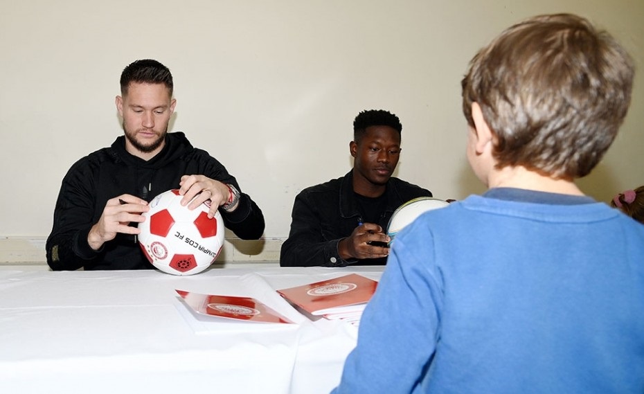 Σε εορταστικό κλίμα, ποδοσφαιριστές του Ολυμπιακού συνάντησαν μικρούς θαυμαστές τους στη διάρκεια του χριστουγεννιάτικου μπαζάρ του Κολλεγίου Αθηνών.