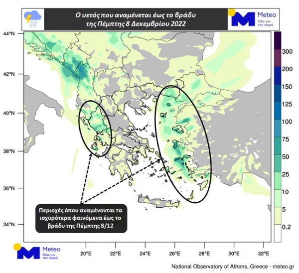 Στον χάρτη που ακολουθεί φαίνεται ο αθροιστικός υετός που αναμένεται έως το βράδυ της Πέμπτης 08/12 και σημειώνονται οι περιοχές όπου αναμένονται τα ισχυρότερα φαινόμενα.