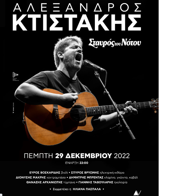 Λίγο πριν φύγει η χρονιά κι ύστερα από ένα γεμάτο συναυλιακό καλοκαίρι στο πλευρό της Μελίνας Κανά και του Θανάση Παπακωνσταντίνου, την Πέμπτη 29 Δεκεμβρίου ο Αλέξανδρος Κτιστάκης έρχεται μαζί με την μπάντα του για μια μεγάλη συναυλία στον Σταυρό του Νότου.