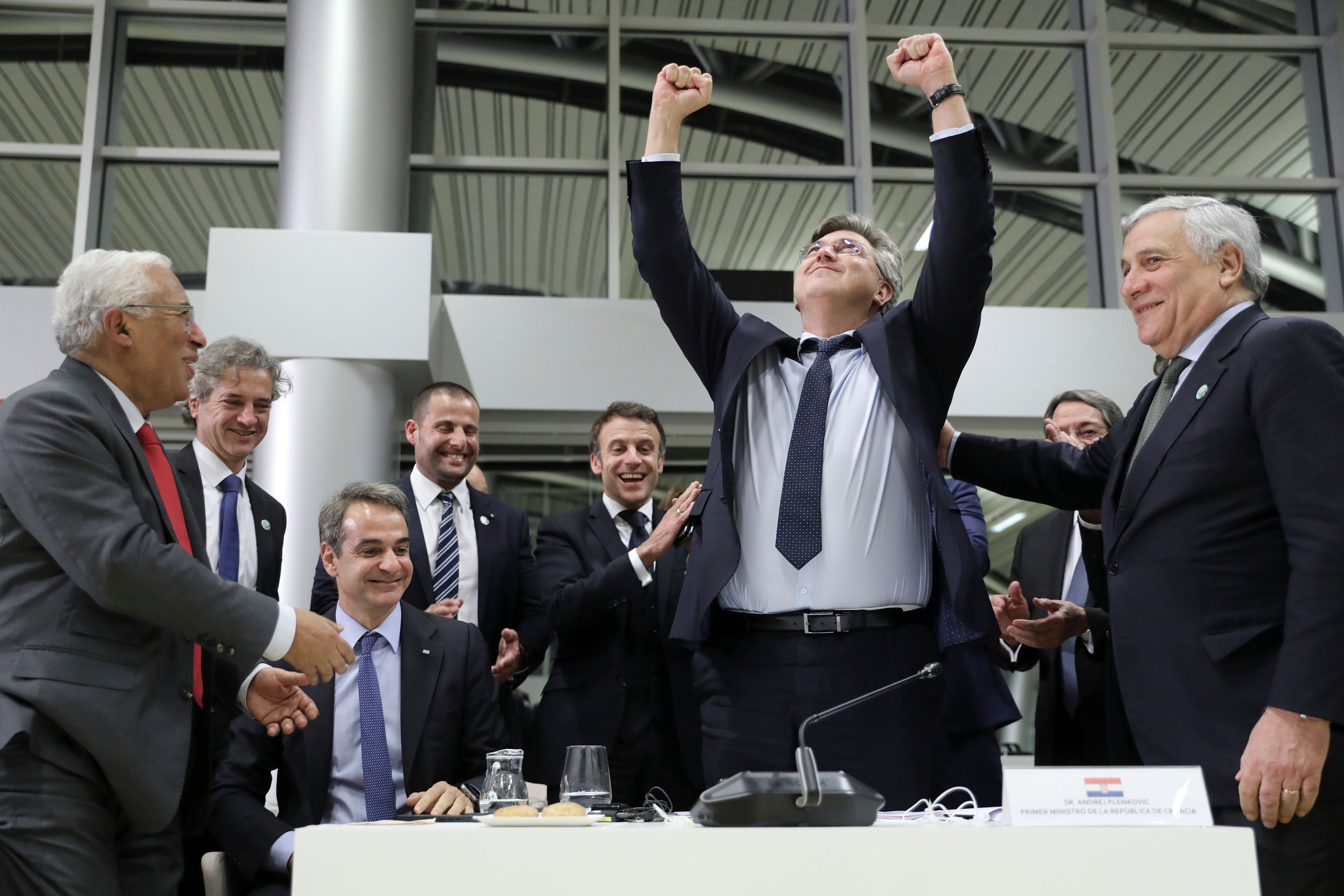 Μέσα σε γέλια χαράς του Κροάτη πρωθυπουργού οι άλλοι οχτώ ηγέτες του ευρωπαϊκού νότου άρχισαν τα χειροκροτήματα.