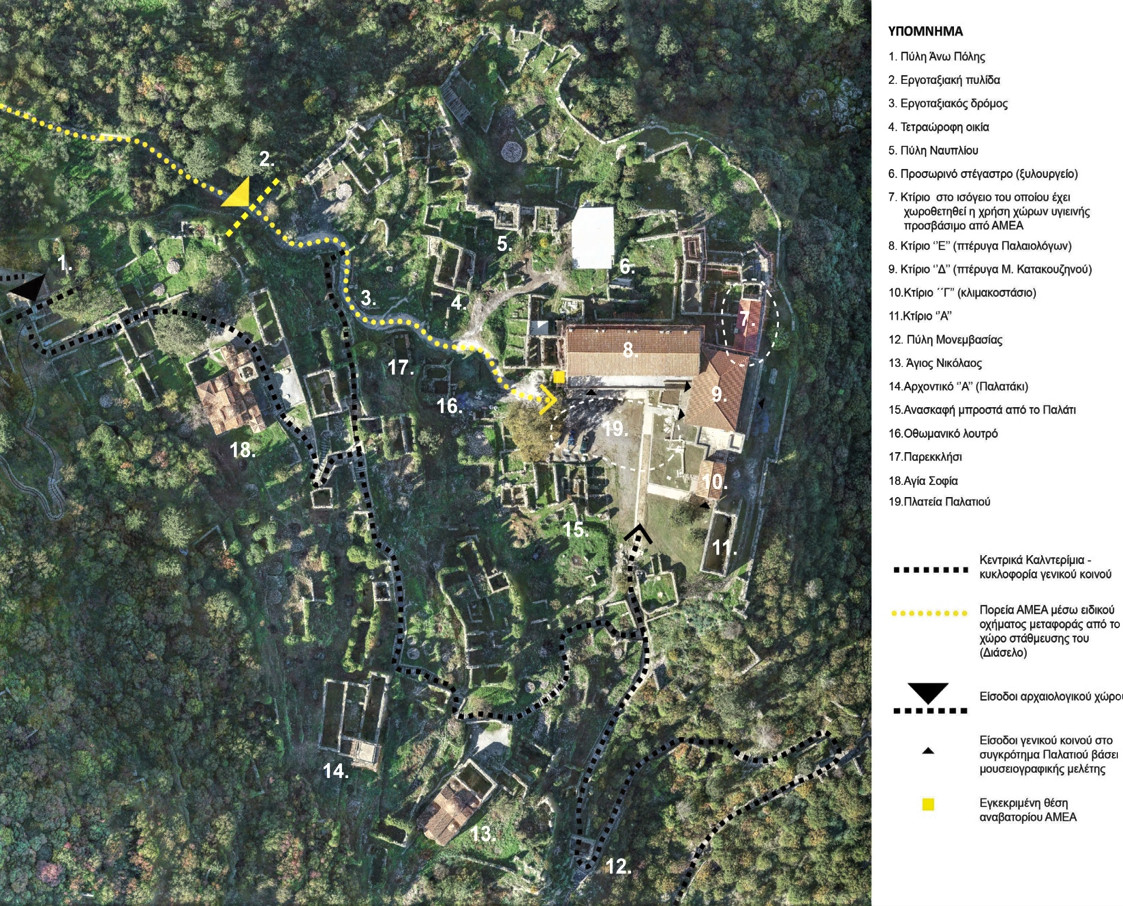 Καθολική πρόσβαση παρέχουν στα ΑμεΑ και στα εμποδιζόμενα άτομα οι διαμορφώσεις του περιβάλλοντος χώρου και το δίκτυο των διαδρομών. Αποκαθίσταται η πλατεία, έμπροσθεν του Ανακτόρου, όπως είχε διαμορφωθεί στο α΄ μισό του 15ου αι. –ο χώρος λειτουργούσε ως διοικητικό κέντρο, προσωρινή έδρα της αυτοκρατορικής διοίκησης- ενώ η υφιστάμενη ατραπός δέχεται βελτιωτικές παρεμβάσεις, ώστε να διασφαλιστεί η πρόσβαση στο Παλάτι σε άτομα μειωμένης κινητικότητας, με ειδικό όχημα μεταφοράς και μέσω εξωτερικού αναβατορίου. Ολοι οι χώροι του μνημείου καθίστανται απολύτως επισκέψιμοι.