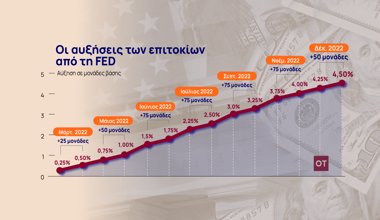 Σε νέα αύξηση των επιτοκίων, αυτή τη φορά κατά 50 μονάδες βάσης, προχώρησε η Ομοσπονδιακή Τράπεζα των ΗΠΑ σε μια προσπάθεια να συγκρατήσει τον πληθωρισμό που «τρέχει» με πολλαπλάσιο ρυθμό από το στόχο του 2%. Το βασικό επιτόκιο δανεισμού σε δολάρια της FED διαμορφώνεται πλέον στο εύρος από 4,25% έως 4,50% και είναι το υψηλότερο από το 2007.