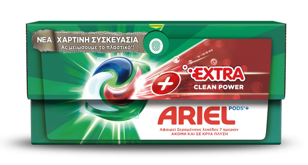 Έχοντας αναπτυχθεί στο πλαίσιο της σταθερής προσπάθειας της P&G να περιορίσει τη χρήση πλαστικού, το νέο ECOCLIC® box είναι πλήρως ανακυκλώσιμο και αποτελείται εξ ολοκλήρου από χαρτί. Όχι, όμως, από οποιοδήποτε χαρτί: η νέα συσκευασία είναι πιστοποιημένη από το FSC (Συμβούλιο Διαχείρισης Δασών)*, ενώ κατασκευάζεται από ανακυκλωμένες ίνες σε ποσοστό που ξεπερνά το 70%. Πρακτικά, αυτό σημαίνει ότι αν όλοι οι χρήστες Ariel Pods απαρνιόμασταν την πλαστική του συσκευασία, θα μπορούσαμε να εξοικονομήσουμε έως και 6.500 τόνους πλαστικού ετησίως μόνο στην Ευρώπη**.