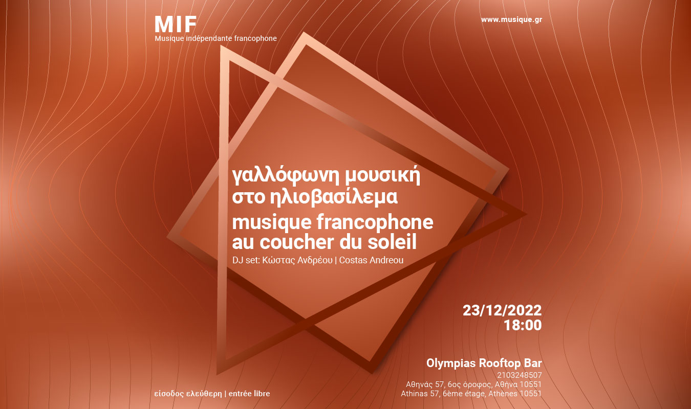 Την Παρασκευή 23 Δεκεμβρίου, στη φιλόξενη ταράτσα του Olympias Rooftop Bar, στην οδό Αθηνάς 57, από την ώρα του ηλιοβασιλέματος μέχρι αργά το βράδυ, ο μουσικός Κώστας Ανδρέου θα παρουσιάσει το επόμενο DJ set του, σε μια απολαυστική ανασκόπηση των playlists της δράσης MIF (Musique Indépendante Francophone – Ανεξάρτητη Γαλλόφωνη Μουσική) που έχουν δημοσιευτεί μέχρι τώρα.