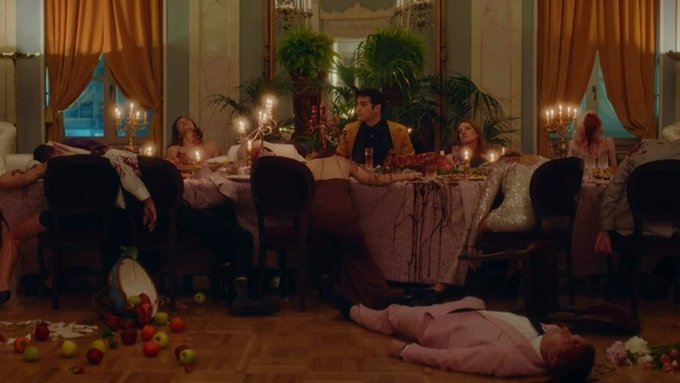Πρόκειται για μια σκηνή -που χαρακτηρίστηκαν από τον συμβολισμό, την αλληγορία και τον σουρεαλισμό, για να μπορέσει να αποδοθεί ο ψυχισμός του ήρωα- στο μεγάλο πλούσιο τραπέζι, ο πρωταγωνιστής σκέφτεται τη ζωή του και στην επόμενη σκηνή φαντάζεται ότι τους έχει σκοτώσει όλους με ένα κηροπήγιο. Στη συνέχεια απολαμβάνει μόνος του, μέσα στα αίματα, το φαγητό του.