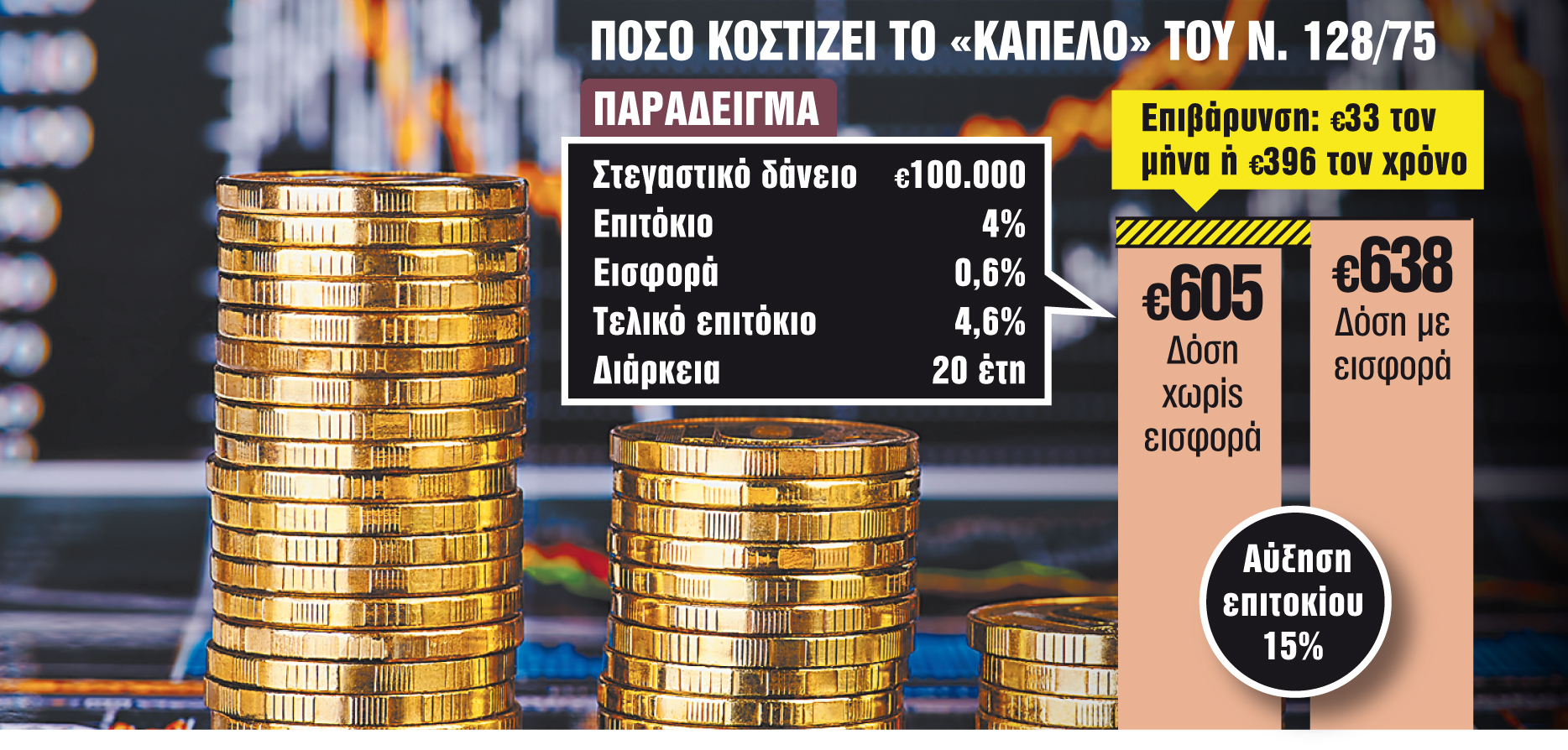 Πρόκειται για τη γνωστή και ως εισφορά του νόμου 128/75, η οποία προστίθεται στο επιτόκιο του δανείου, την πληρώνει ο δανειολήπτης στην τράπεζα και η τελευταία την αποδίδει στο Δημόσιο. Αν, για παράδειγμα, το επιτόκιο ενός στεγαστικού δανείου είναι 4%, τότε ο δανειολήπτης πληρώνει δόση, η οποία υπολογίζεται βάσει του επιτοκίου (4%) συν την εισφορά. Δηλαδή, πληρώνει 0,6%. Το ποσοστό αυτό αντιστοιχεί σε επιδότηση του 50% μιας αύξησης επιτοκίων κατά 1,2 ποσοστιαίες μονάδες, μιας και το σχέδιο που συμφωνήθηκε με τις τράπεζες προβλέπει την επιδότηση της μισής αύξησης του επιτοκίου από τα τέλη Ιουνίου 2022. Με τη διαφορά ότι αυτή η επιβάρυνση ισχύει για όλους τους δανειολήπτες (ελληνικών τραπεζών μόνο) και για όλα τα επίπεδα επιτοκίων όλων των περιόδων.