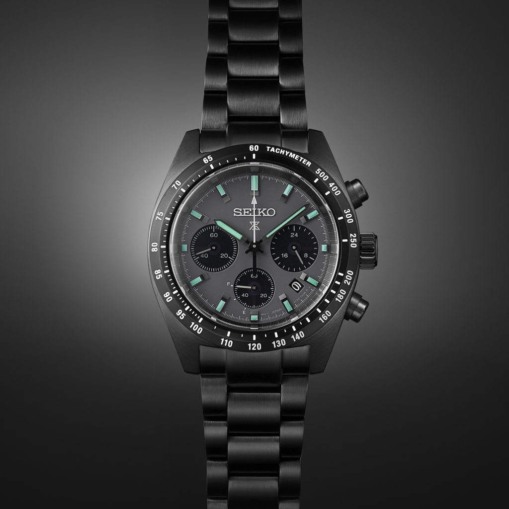 Για να αποδώσει αυτή την αίσθηση, η Seiko ντύνει στα μαύρα κάθε χρόνο ορισμένα από τα πλέον κλασικά και δημοφιλή μοντέλα της. Και στην περίπτωση της «νυχτερινής» εκδοχής του Speedtimer, η μαύρη λάκα πρωταγωνιστεί στο καντράν, το στιβαρό μπρασελέ ενδύεται πολυτελείς σκούρους τόνους και το νέο, πράσινο «Lumibrite Pro» στους δείκτες και τις ενδείξεις της ώρας, διασφαλίζει τη βέλτιστη δυνατή ορατότητα ακόμη και σε συνθήκες απόλυτου σκότους.