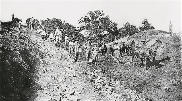Για την υλοποίηση του έργου, κατέφτασαν εκατοντάδες εργάτες από την Ευρώπη. Ανάμεσά τους, κυνηγώντας το όνειρο μιας καλύτερης ζωής, βρίσκονταν και τρεις Ελληνες, οι οποίοι, αφού εργάστηκαν στο τμήμα της γραμμής που ένωνε το Κάνσας Σίτι με το γειτονικό Λιτλ Ροκ, αποφάσισαν να παραμείνουν στην περιοχή και να τη μετατρέψουν, μαζί με μερικούς Ισπανούς, σε καλλιεργήσιμη γη. Το κίνητρο ήταν ισχυρό: Το 1850 οι τοπικές Αρχές πρόσφεραν εκτάσεις βάλτων σε αποίκους έναντι μόλις πενήντα σεντς ανά στρέμμα, αν οι αγοραστές συμφωνούσαν να χτίσουν αναχώματα ενώ χάριζαν τη φορολογία σε όσους υπόσχονταν ότι θα πληρώσουν φόρους στο μέλλον.