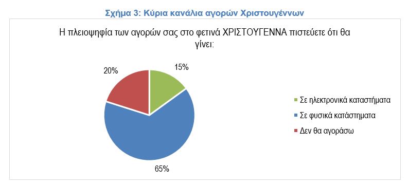 Σε σχέση με τις διαδικτυακές αγορές, όπως φαίνεται στο σχήμα 3, το 15% δηλώνει ότι θα κάνει το μεγαλύτερο μέρος των αγορών του ηλεκτρονικά (έναντι 16% το 2021), ποσοστό που δείχνει τη δυναμική των ηλεκτρονικών καταστημάτων. Το 65% δηλώνει ότι θα κάνει το μεγαλύτερο μέρος σε φυσικά καταστήματα, ενώ ένα 20% δηλώνει ότι δεν θα αγοράσει. Πρακτικά η αναλογία διαμορφώνεται σε 1 καταναλωτής αγοράζει κυρίως ηλεκτρονικά για 4 καταναλωτές που αγοράζουν κυρίως φυσικά.