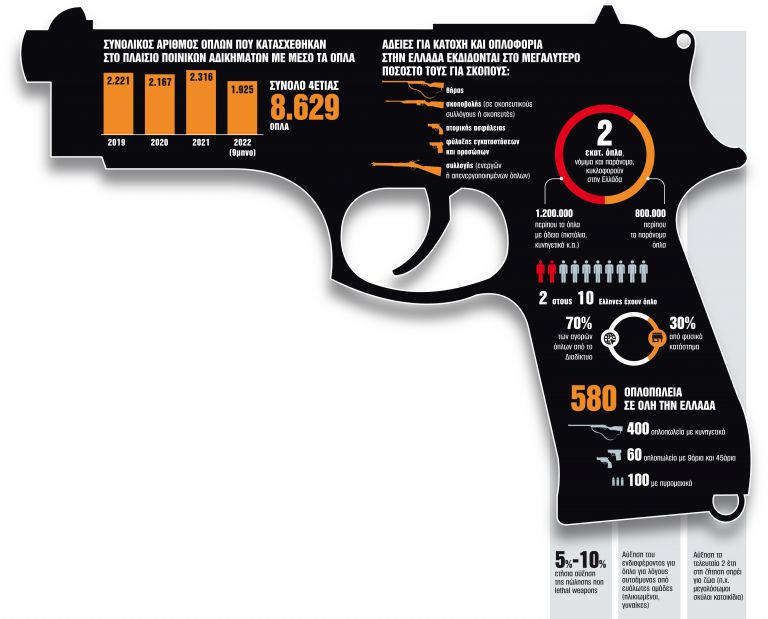 Σύμφωνα με πληροφορίες από έρευνα επί του θέματος προκύπτει ότι στην Ελλάδα υπολογίζεται ότι κυκλοφορούν περίπου 2.000.000 όπλα, νόμιμα και παράνομα. Εξ αυτών, τα 800.000 είναι όπλα χωρίς άδεια σε άγνωστα χέρια και τα υπόλοιπα 1.200.000 είναι όπλα (πιστόλια, κυνηγετικά κ.ά.) με άδεια.