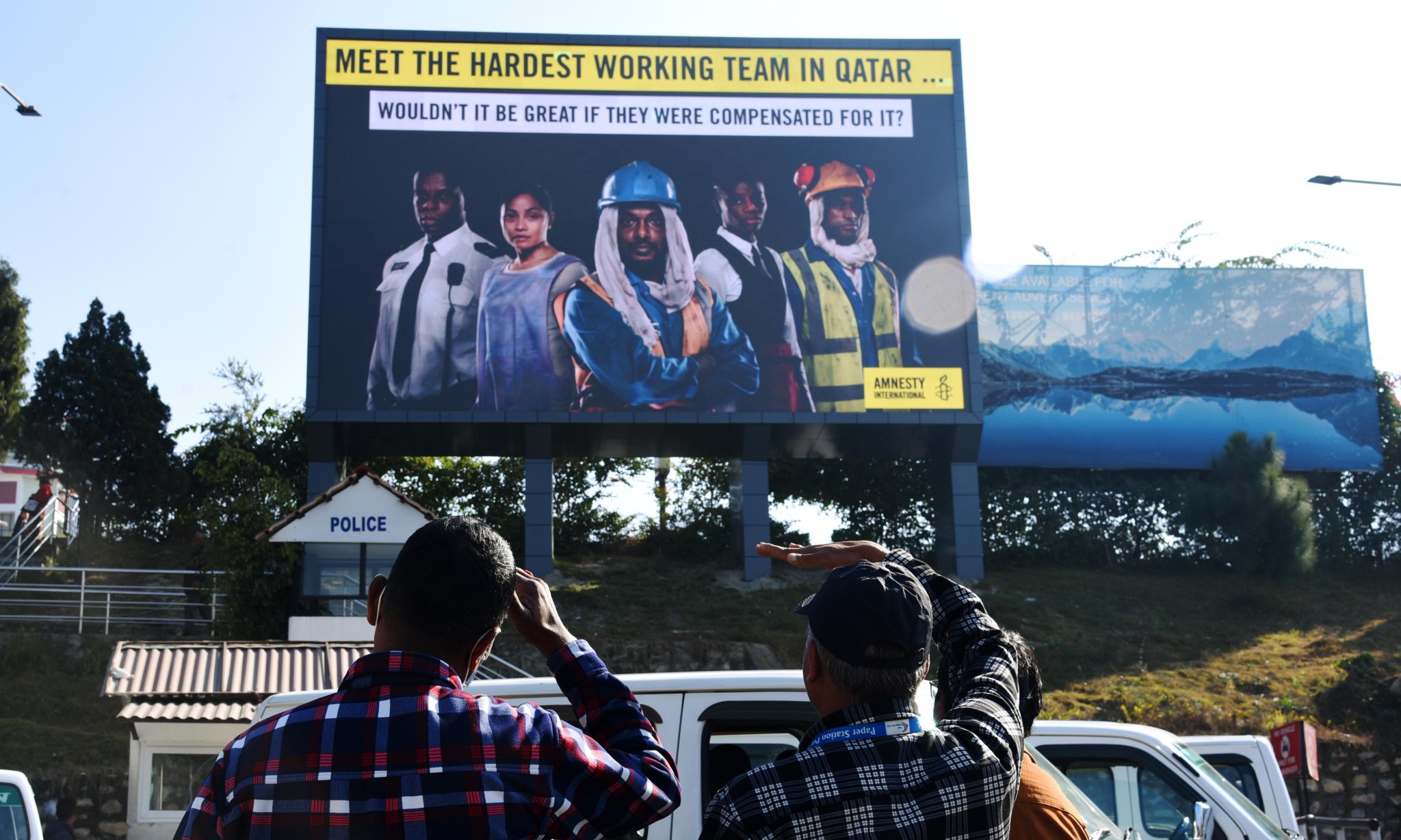 «Γνωρίστε την πιο σκληρά εργαζόμενη ομάδα στο Κατάρ. Δεν θα ήταν καλύτερα αν αποζημιώνονταν» γράφει πινακίδα στο Κατμαντού του Νεπάλ (Διεθνής Αμνηστία)