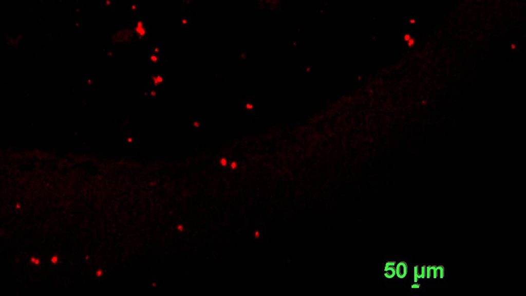 Μικροπλαστικά που έγιναν ορατά με χρήση χρωστικής. Πενήντα μικρόμετρα ισούνται με 0,05 χιλιοστά (University of Aucland)