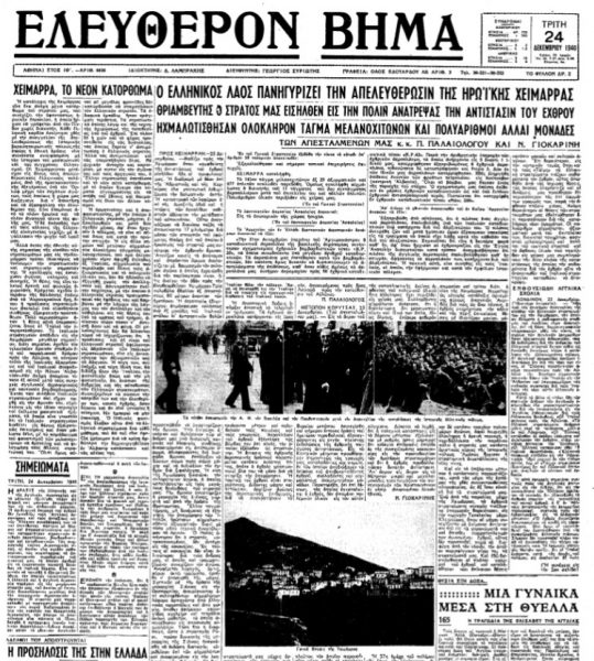 Σε αυτό το πλαίσιο, και δεδομένου ότι η επίσκεψη του έλληνα πρωθυπουργού στη Χειμάρρα πραγματοποιείται στην 82η επέτειο της απελευθέρωσής της από τον Ελληνικό Στρατό κατά τη διάρκεια του Ελληνοϊταλικού Πολέμου, το ενδιαφέρον μας στράφηκε στο πρωτοσέλιδο της εφημερίδας «Ελεύθερον Βήμα» που είχε κυκλοφορήσει την Τρίτη 24 Δεκεμβρίου 1940.