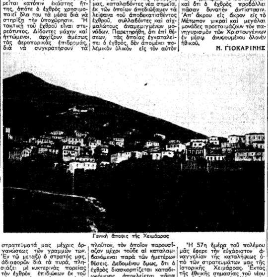 «Η κατάληψις της Χειμάρρας είνε ένα ακόμη μέγα κατόρθωμα του στρατού μας, που συνεχίζει την αφαντάστως ηρωικήν εποποιίαν, η οποία ήρχισε να γράφεται από την Πίνδον χωρίς διακοπήν. Κάθε ελληνική καρδία εσκίρτησε χθες με την αναγγελίαν της απελευθερώσεως της ιστορικής βορειοηπειρωτικής πόλεως, της οποίας η εθνική δράσις είνε στενότατα συνυφασμένη με την ιστορίαν του μεσαιωνικού και του συγχρόνου ελληνισμού. Οι Χειμαρριώται μετέσχον εις όλους τους απελευθερωτικούς ελληνικούς πολέμους, από της προεπαναστατικής εξεγέρσεως υπό τον Ορλώφ μέχρι των εσχάτων αγώνων τους οποίους η χώρα μας διεξήγαγε διά ν’ αποκτήση και να εξασφαλίση την ελευθερίαν της. Είνε επομένως από τα πλέον ηρωικά και τα πλέον αγαπητά τέκνα της φυλής μας. Η δε επάνοδός των εις τους κόλπους της ελληνικής οικογενείας γεμίζει με αγαλλίασιν την ψυχήν του λαού μας.