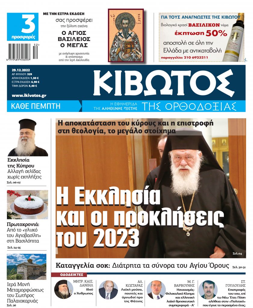 Η Εκκλησία και οι προκλήσεις του 2023 Η αποκατάσταση του κύρους και η επιστροφή στη θεολογία, το μεγάλο στοίχημα Εκκλησία της Κύπρου: Αλλαγή σελίδας χωρίς εκπλήξεις Καταγγελία σοκ: Διάτρητα τα σύνορα του Αγίου Όρου Πρωτοχρονιά: Από το «γλυκό του Αγιοβασίλη» στη Βασιλόπιτα Προσκύνημα Για παλαιότερα ένθετα της Κιβωτού, πληροφορίες και παραγγελίες,