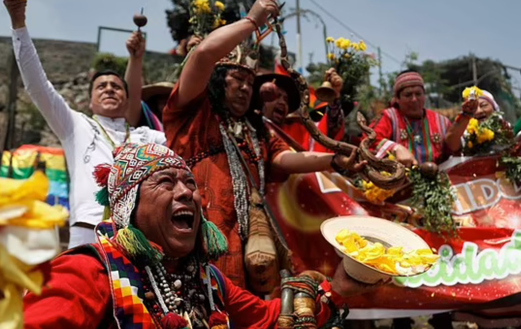 Φορώντας παραδοσιακές ενδυμασίες των Ανδεων, οι σαμάνοι καλωσόρισαν το νέο έτος με μια τελετή εξαγνισμού, η οποία είχε λουλούδια, θυμίαμα, ένα φίδι και φωτογραφίες των προέδρων της Ουκρανίας και της Ρωσίας.