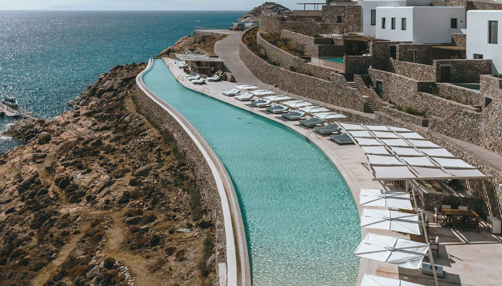 Η δομή του ξενοδοχείου ακολουθεί τη φυσική ροή του εδάφους, με τοπική πέτρα και μάρμαρο σε όλο το χώρο, κάνοντας το ξενοδοχείο μέρος της φυσικής κυκλαδίτικης αρχιτεκτονικής.