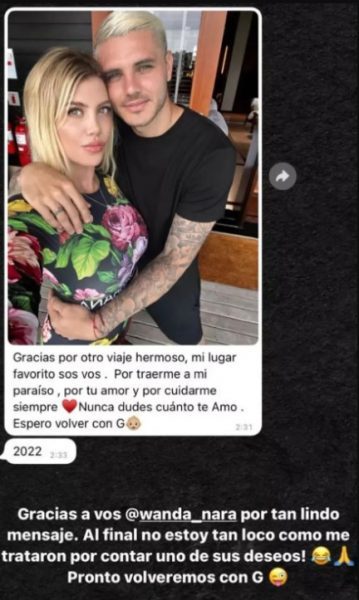 «Σε ευχαριστώ για άλλο ένα όμορφο ταξίδι, το αγαπημένο μου μέρος είσαι εσύ. Σε ευχαριστώ που με έφερες στον παράδεισό μου, για την αγάπη σου και που πάντα με φροντίζεις. Ποτέ μην αμφιβάλλεις πόσο πολύ σε αγαπώ. Ελπίζω να επιστρέψω με το G», έγραψε η Γουάντα Νάρα στο μήνυμα που του έστειλε, το οποίο συνόδευσε με το emoji ενός μωρού, που εκτόξευσε τις φήμες εγκυμοσύνης.