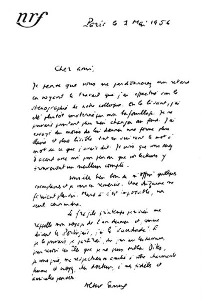 Υπάρχουν στιγμές στην ζωή μας που βαραίνουν πολύ και αφήνουν επάνω μας τα σημάδια, που στη συνέχεια τροφοδοτούν την μνήμη και δίνουν περιεχόμενο στην ύπαρξή μας. Έτσι, αυτές οι μέρες που ζήσαμε μαζί με τον Camus, όταν πρωτοήλθε στην Αθήνα, μας χάρισαν ώρες φωτεινές κι αξέχαστες. Όπως εκείνες του Γαλλικού Ινστιτούτου, στην διαλογική συζήτηση που είχα οργανώσει σαν πρόεδρος της Ελληνογαλλικής Πνευματικής Ένωσης, με κεντρικό πρόσωπο τον Camus και θέμα το μέλλον του ευρωπαϊκού πολιτισμού. Σ’ αυτήν την γεμάτη λάμψη, εκπληκτική βραδιά, πρωτόγνωρη στο αθηναϊκό κοινό, η ελληνική διανόηση, που αντιπροσώπευσαν τα πιο τρανταχτά ονόματα (Κωνσταντίνος Τσάτσος, Ευάγγελος Παπανούτσος, Γιώργος Θεοτοκάς, Χατζηκυριάκος-Γκίκας, Φαίδων Βεγλερής, Ανδρέας Εμπειρίκος), στάθηκε δίπλα στον κορυφαίο συγγραφέα και φιλόσοφο, σε ένα ευτυχισμένο, αρμονικό συναπάντημα της γαλλικής με την ελληνική σκέψη. Στην πνευματική αυτή ευωχία, που είχα το δύσκολο έργο να διευθύνω, ακούστηκε ο Camus και γύρω μας φτερούγισε το άνθος της πολιτιστικής Ευρώπης: η πορεία του πολιτισμού, αλλά και η βεβαιότητα πως ο πολιτισμός αυτός με τη σκυτάλη της ελληνικής κληρονομιάς στο χέρι θα συνέχιζε τον δρόμο του με βήμα σταθερό. Το αστραφτερό μυαλό του Camus και ο λόγος του, σπίθα δεξιοτεχνίας και πάθους, κράτησαν πάνω από δύο ώρες σε πνευματική διέγερση ένα πλήθος ακροατών, μέσα και έξω από το Ινστιτούτο.
