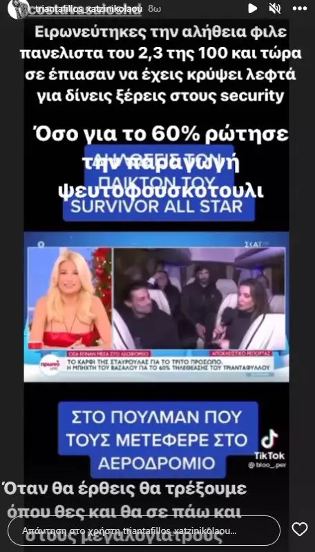 Η ανάρτηση έγινε με αφορμή το σχόλιο που έκανε ο Κωνσταντίνος Βασάλος για την τηλεθέαση του Survivor: «Α, δεν θα κάνουμε 60% τηλεθέαση δεν πειράζει. Τώρα που δεν ήρθε πως θα κάνουμε 60%; Θα τον ήθελα, είναι περίπτωση».