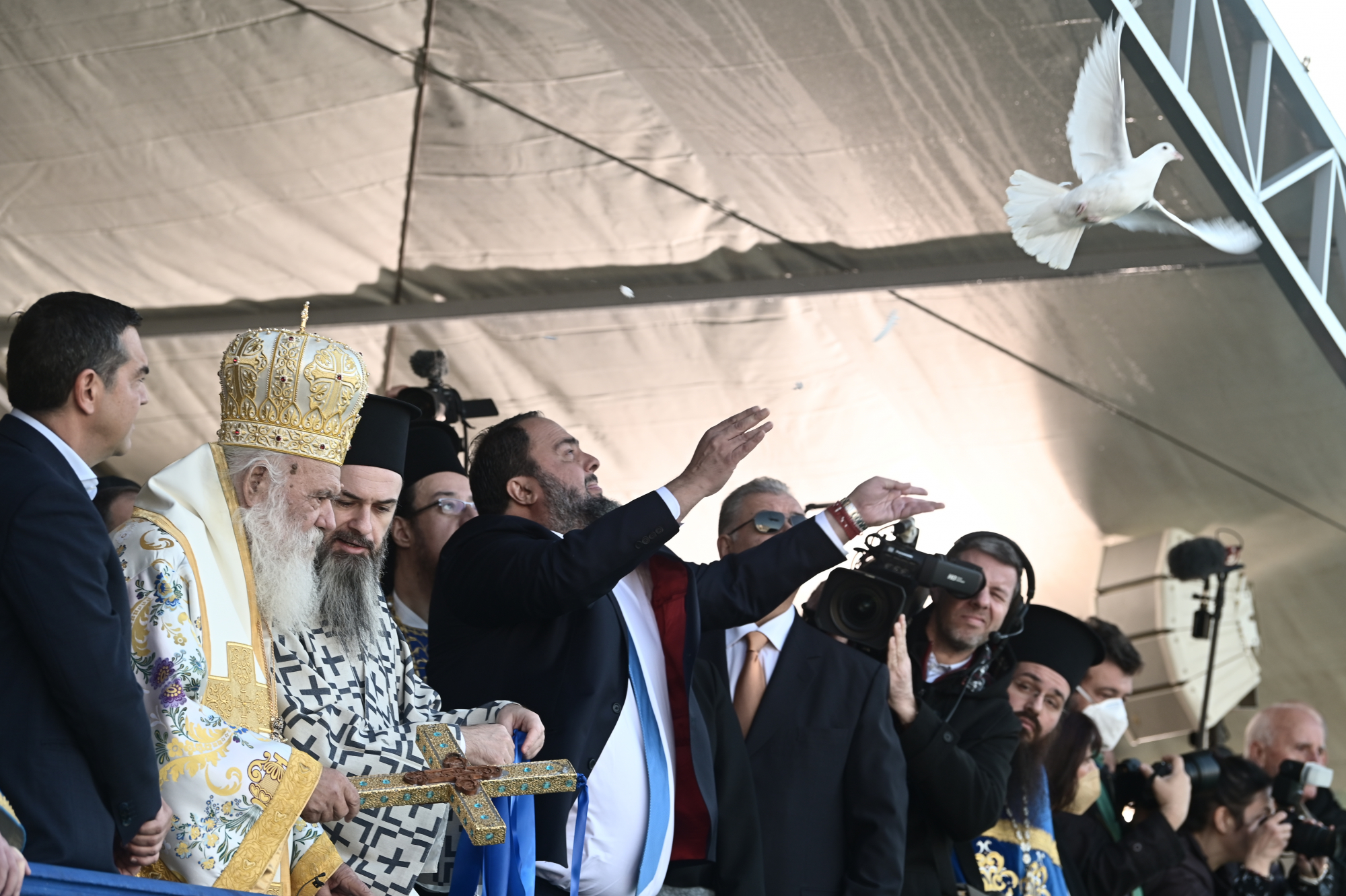 Ο Αλέξης Τσίπρας, ο Γιάννης Πλακιωτάκης και ο Βαγγέλης Μαρινάκης ελευθέρωσαν λευκά περιστέρια που συμβολίζουν το Άγιο Πνεύμα.