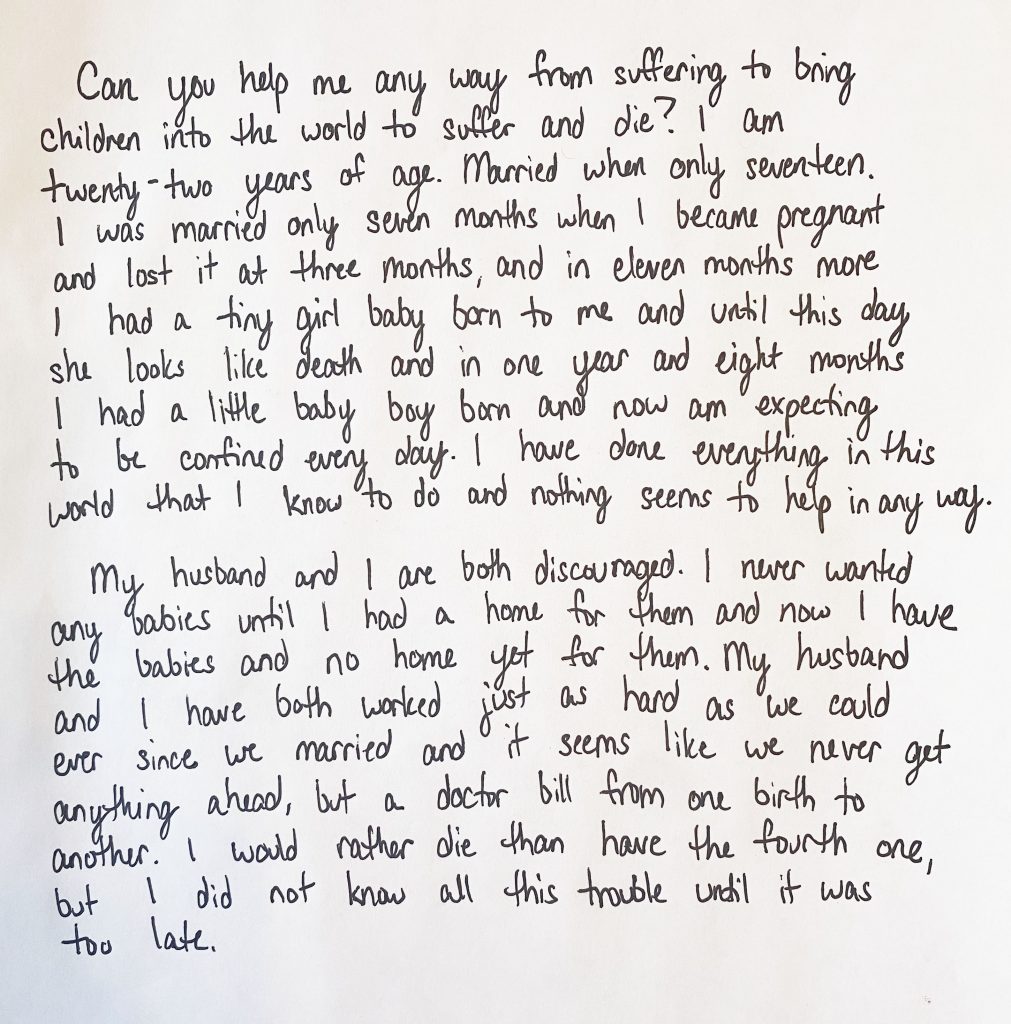 Το 1928, η Μάργκαρετ Σάνγκερ, η ιδρύτρια της Planned Parenthood, δημοσίευσε τη «Μητρότητα στη Δουλεία», μια συλλογή επιστολών που της είχαν γράψει γυναίκες σε όλες τις ΗΠΑ εκλιπαρώντας για πληροφορίες σχετικά με την αντισύλληψη. Ήταν αβοήθητες και φοβισμένες, η ζωή τους ένας ατελείωτος κύκλος εγκυμοσύνων και τοκετών, αποβολών και παιδικής θνησιμότητας.