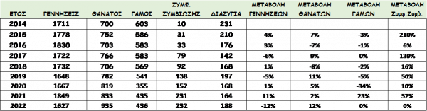 Όπως διακρίνεται στα στοιχεία του Ληξιαρχείου του Δήμου Χανίων, κατά την χρονιά που συμπληρώθηκε, καταγράφηκαν συνολικά 1.627 γεννήσεις, μειωμένες κατά 12% σε σχέση με το 2021, οπότε και είχαν δηλωθεί 1849. Αντίθετα, αντίστοιχο ποσοστό (12%) αλλά αυξημένο σε σχέση με πέρυσι, καταγράφεται στους θανάτους, 935 το 2022, έναντι 833 το 2021, καταγράφοντας τη μεγαλύτερη αύξηση θνησιμότητας της επταετίας.